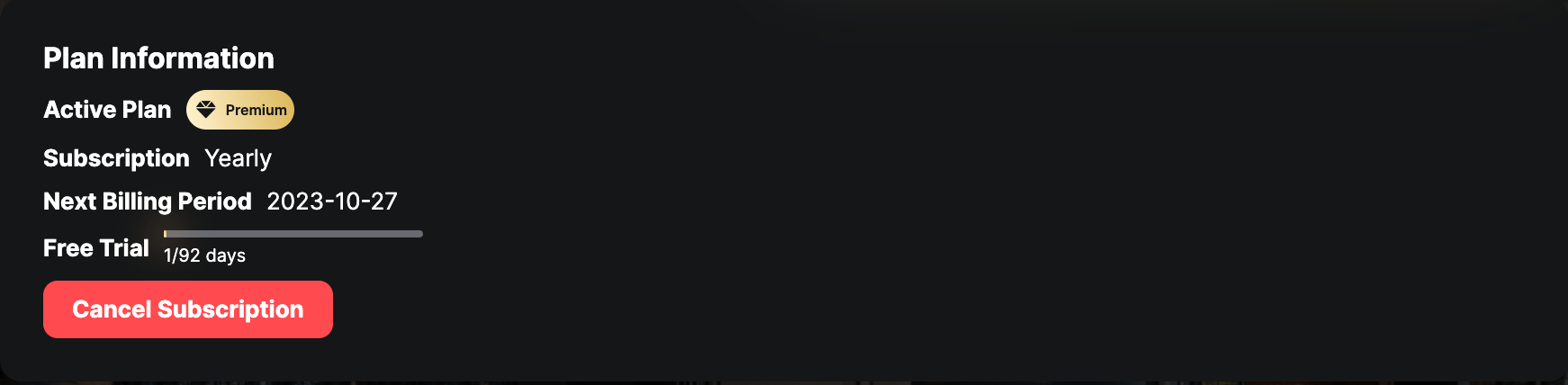 Observe your active plan: Basic Plan or Premium. If on the Premium service, observe your subscription plan: Monthly or Yearly. If on the Premium service, observe your the date of your next billing period. If you wish to cancel your subscription of the Premium service, click the Cancel Subscription button.