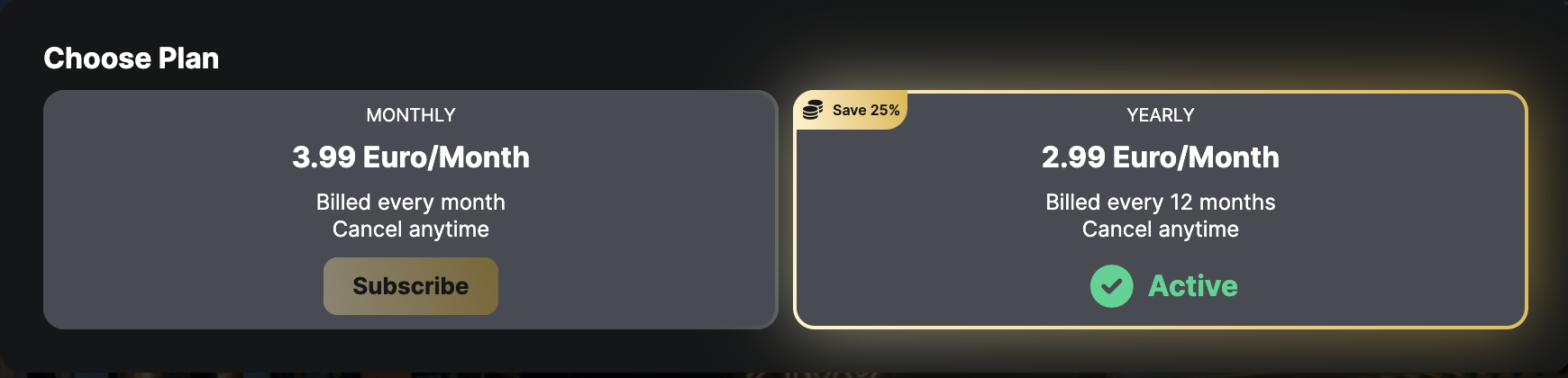 Yearly Plan: For the yearly plan, you are billed every month and can cancel at any time. You are charged €35.99 per year VAT included.