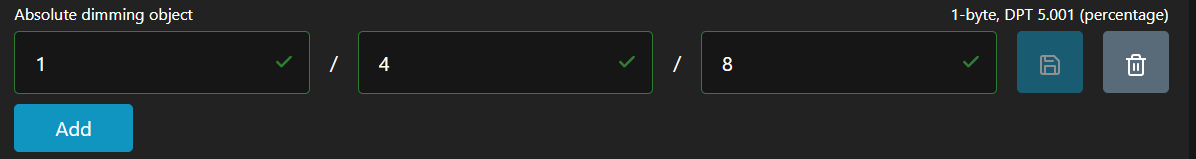 Absolute dimming object- gibGroup addressfür die 1-Byte-Dimmsteuerung an, d.h. PRÄZISE DIMMUNG. Stelle sicher, dass sie die gleiche DPT-Länge hat. In diesem Beispiel ist das GA 1/4/8. Trage diese in die bereitgestellten Felder ein und drücke auf die SchaltflächeSpeichern.