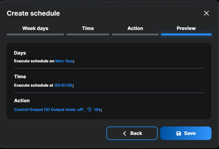 Once saved, the schedule will appear in the Schedules section under the specific device.