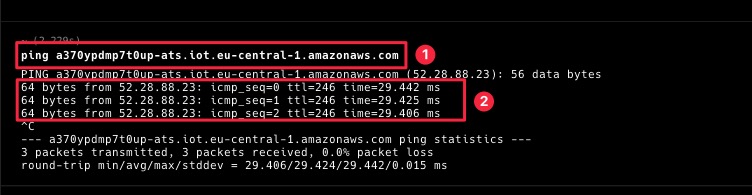 Run a ping test to check network connectivity to your AWS IoT endpoint(you can get the endpoint from the AWS Setup portion of the guide on the last step, remember those values we wrote down? In our case it's):