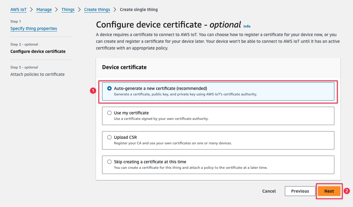 Follow these steps to configure AWS IoT Core, create a Thing, and generate the necessary security credentials.