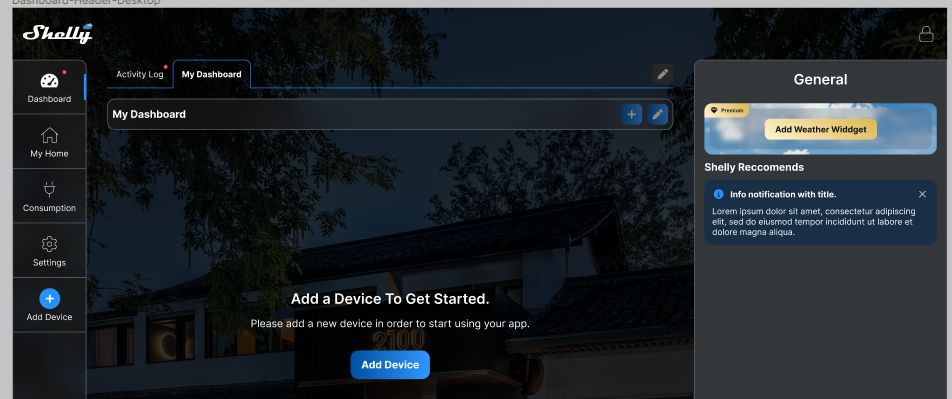The image below shows what the General tab on your Shelly app will like before the weather location has been set. You have the option to add the Weather Widget.