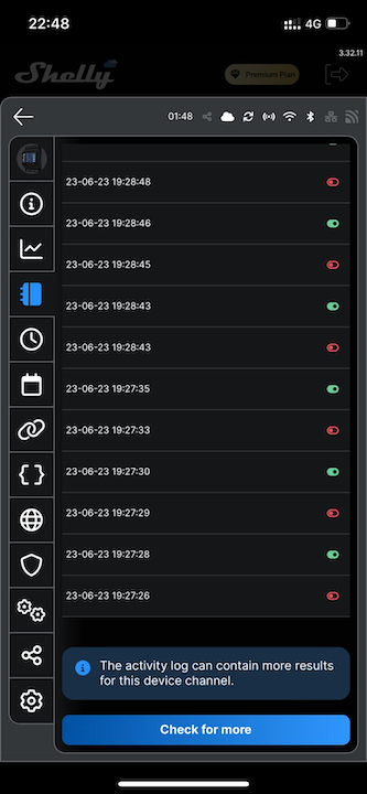 Extended activity log with 100 events per device. In order to view the activity log, navigate to the page of your Shelly Device on the Shelly app, and click on the tab with the Activity Log icon.