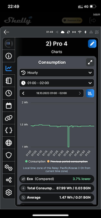 Extended statistics data visualization in 1 min intervals. You can change the time interval of statistical data, such as on the Charts tab of your Shelly Device. Adjust the time interval by choosing the Hourly time filter from the dropdown menu located above the corresponding chart.