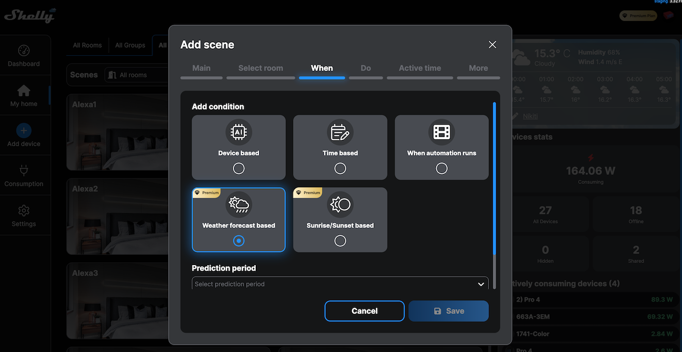 Weather-forecast scene execution. This functionality can be used when creating a scene. Navigate to the ‘My Home’ page of the Shelly app, and click on the ‘All Scenes’ tab at the top of the page. Click the