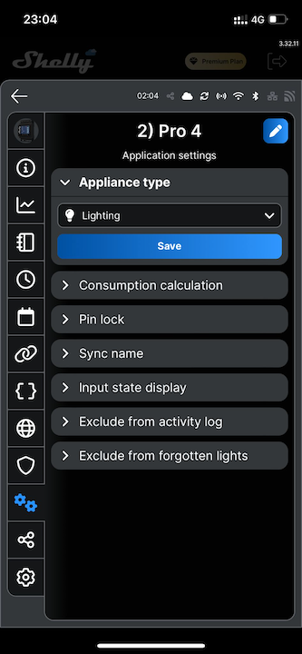 Forgotten lights reminder. The Shelly app has an AI feature that reminds you to turn off your lights if you have forgotten to them turn off. In order for this functionality to work, you must set your Shelly Device to the Lighting ‘Appliance type’ under the ‘Application settings’ tab of your Shelly Device page. This functionality works by analysing the consumption of your Shelly Device, and starts working after collecting data and making note of consumption patterns for one week when on the Premium service.
