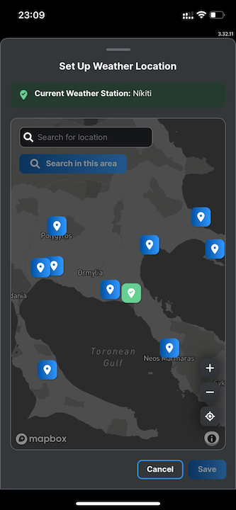 Observe the current weather station, or edit the weather station location. Click the Edit Weather Location button to edit the weather location. Search for a location or click the Search in this area button to navigate to the desired location. Click the + or - button to zoom in/out of the map, or click the Geolocation button to find your location. Click on the desired weather station from which you wish to receive information, and then click the Select button to choose the weather. Once you have selected the weather station, click the Save Location button to set the location.