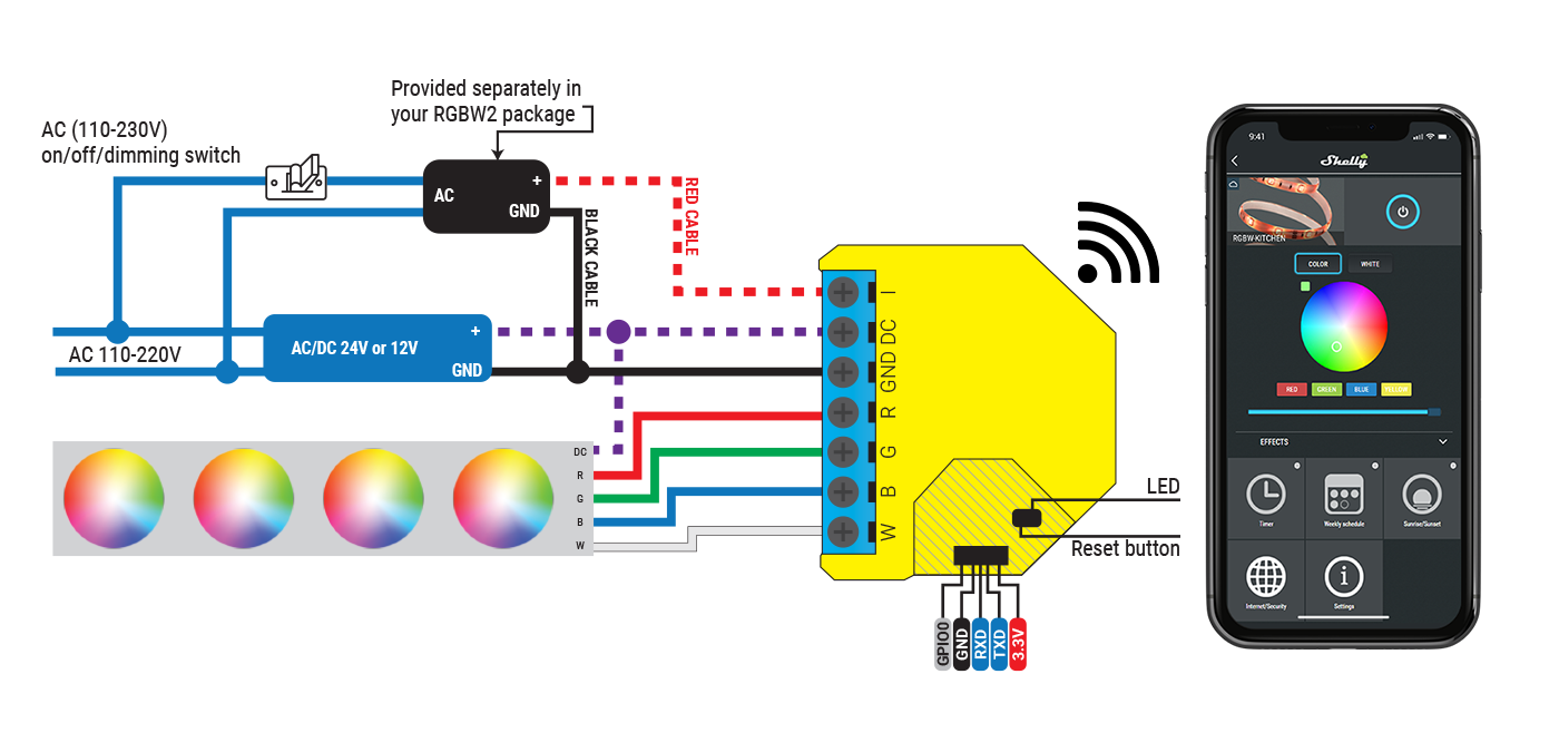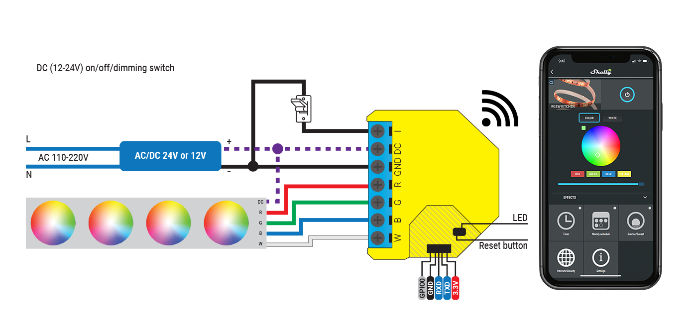 Make your LED strips smart in one easy step. Shelly RGBW2 can connect like any LED controller and allows you to control all your lighting directly from a mobile device or tablet.