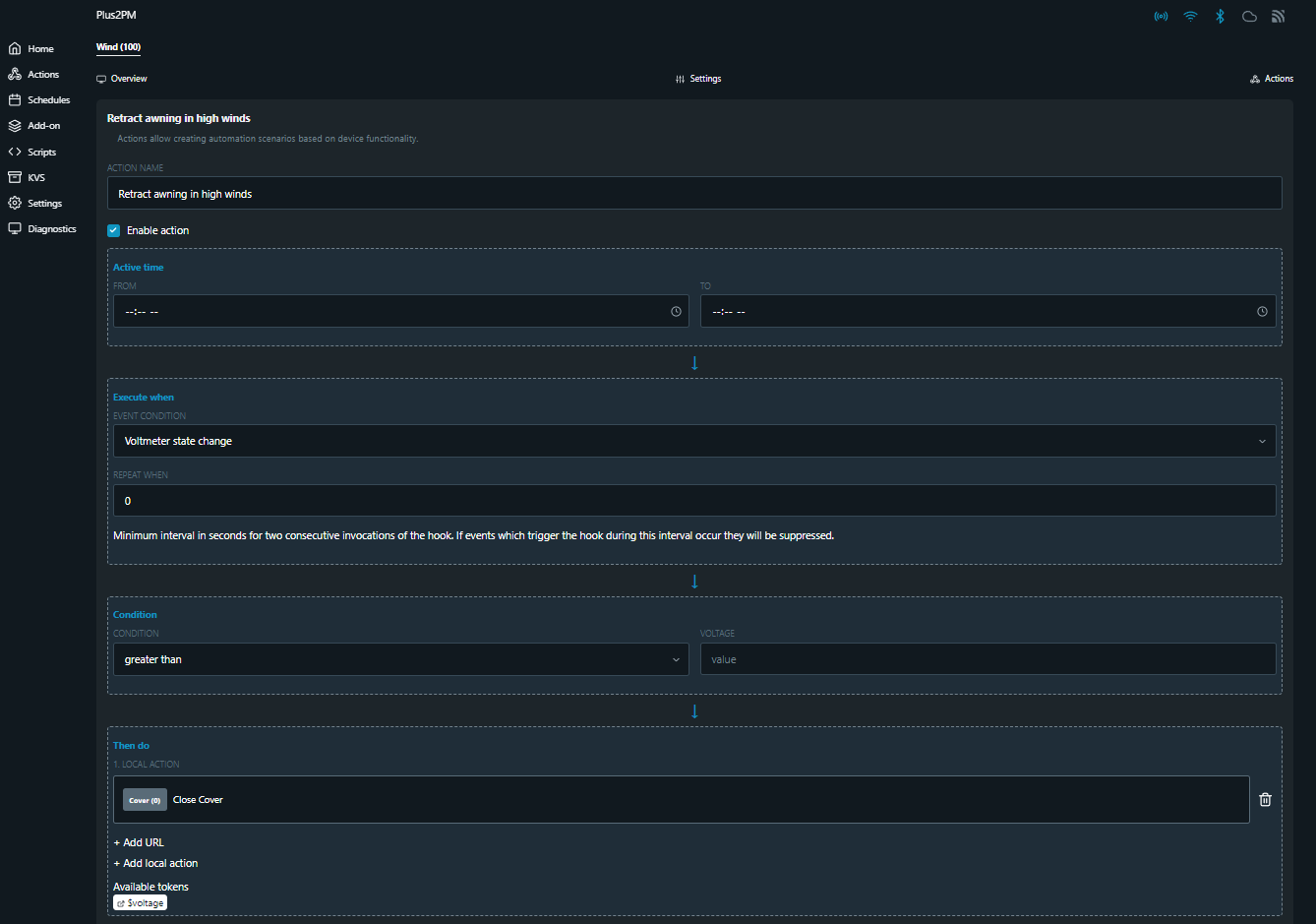 Create an Action to detract awning based on specific wind conditions detected by the sensor