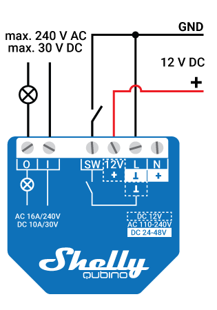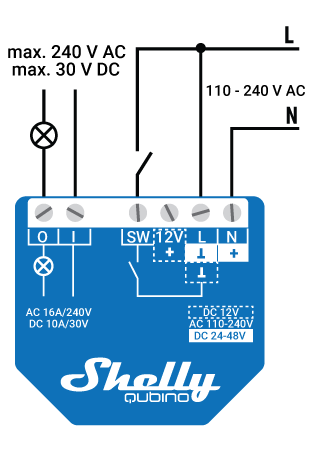 SW | Switch/push-button input terminal (controlling O) | + | 12 / 24 - 48 VDC positive wire |
